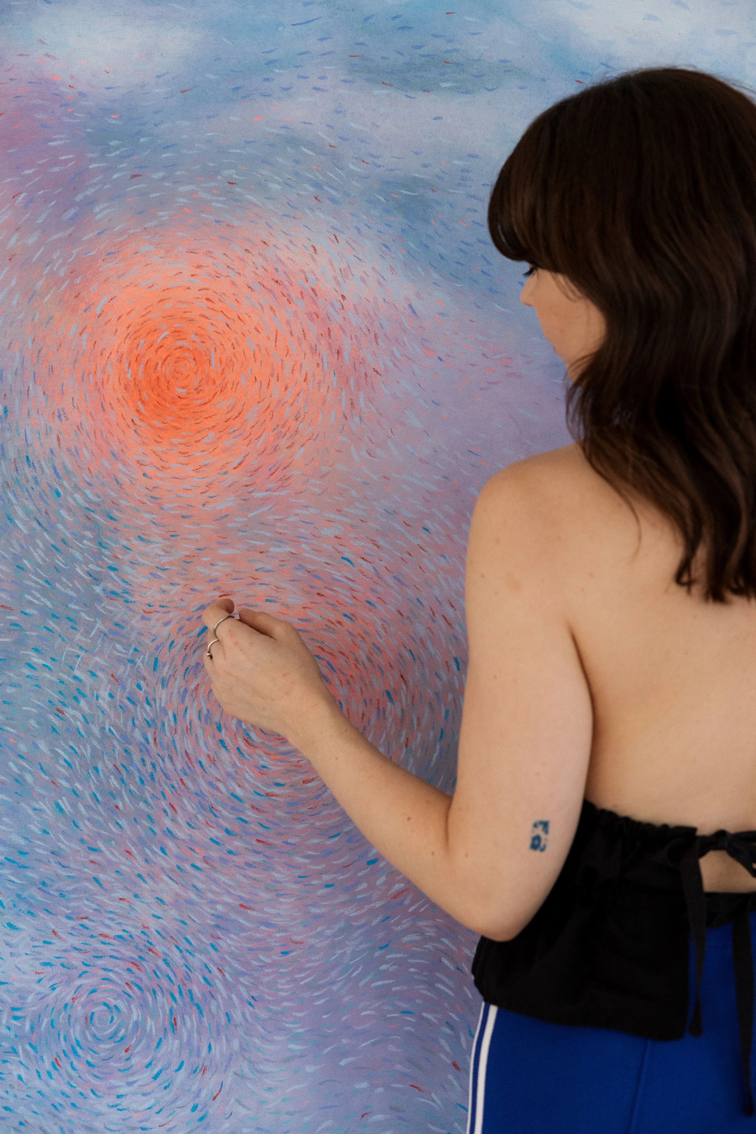 Working through layered gesture and repetition, she builds surfaces that hold and release tension. Marks accumulate, dissolve, and return, tracing patterns that feel both intimate and expansive, like weather systems or thought forms in motion.
